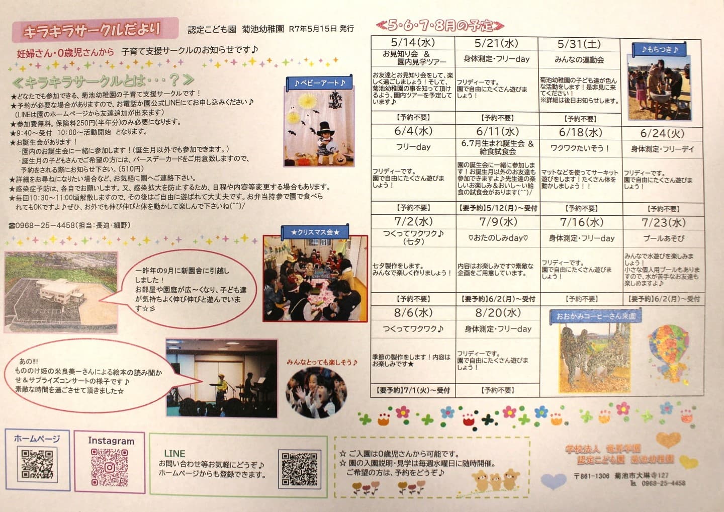 未就園児さんを対象に、キラキラサークル(子育て支援サークル)を行っております。皆さんに楽しんで頂けるような企画を準備しています!初めてのお友達もいつでも大歓迎ですよ!是非遊びに来て下さいね!